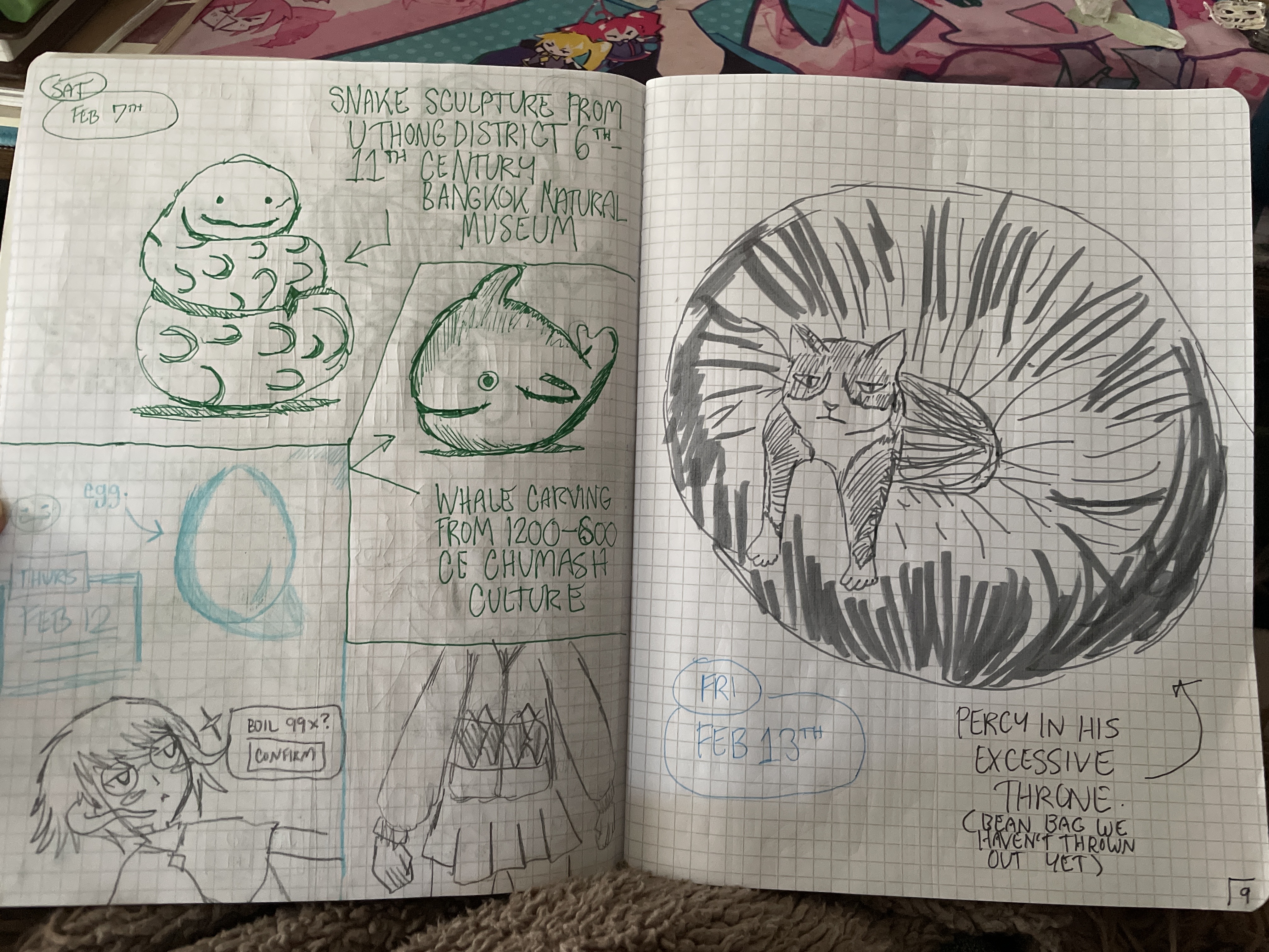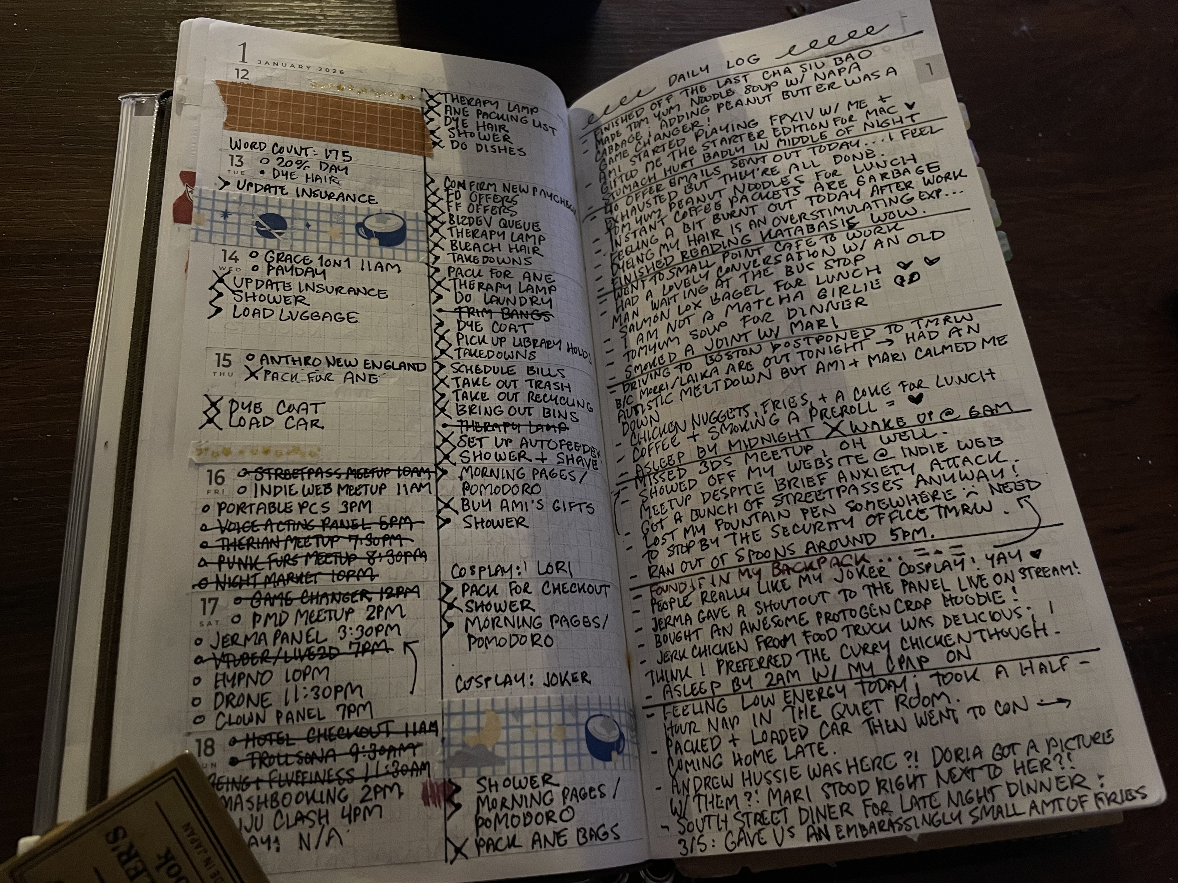i started off doing this by re-dating my now-outdated hobonichi cousin, but sadly it fell apart near the end of january. (that's on me. i ripped out the weekly pages from it because i wasn't using them and that ruined the binding.) so i've moved into an A5 hobonichi graph notebook that i bought a few months ago, and it feels more satisfying to write in because i get extra space that would normally be taken up by hobonichi's daily quotes. i’m optimistic about keeping this up, so long as i have my lamp.