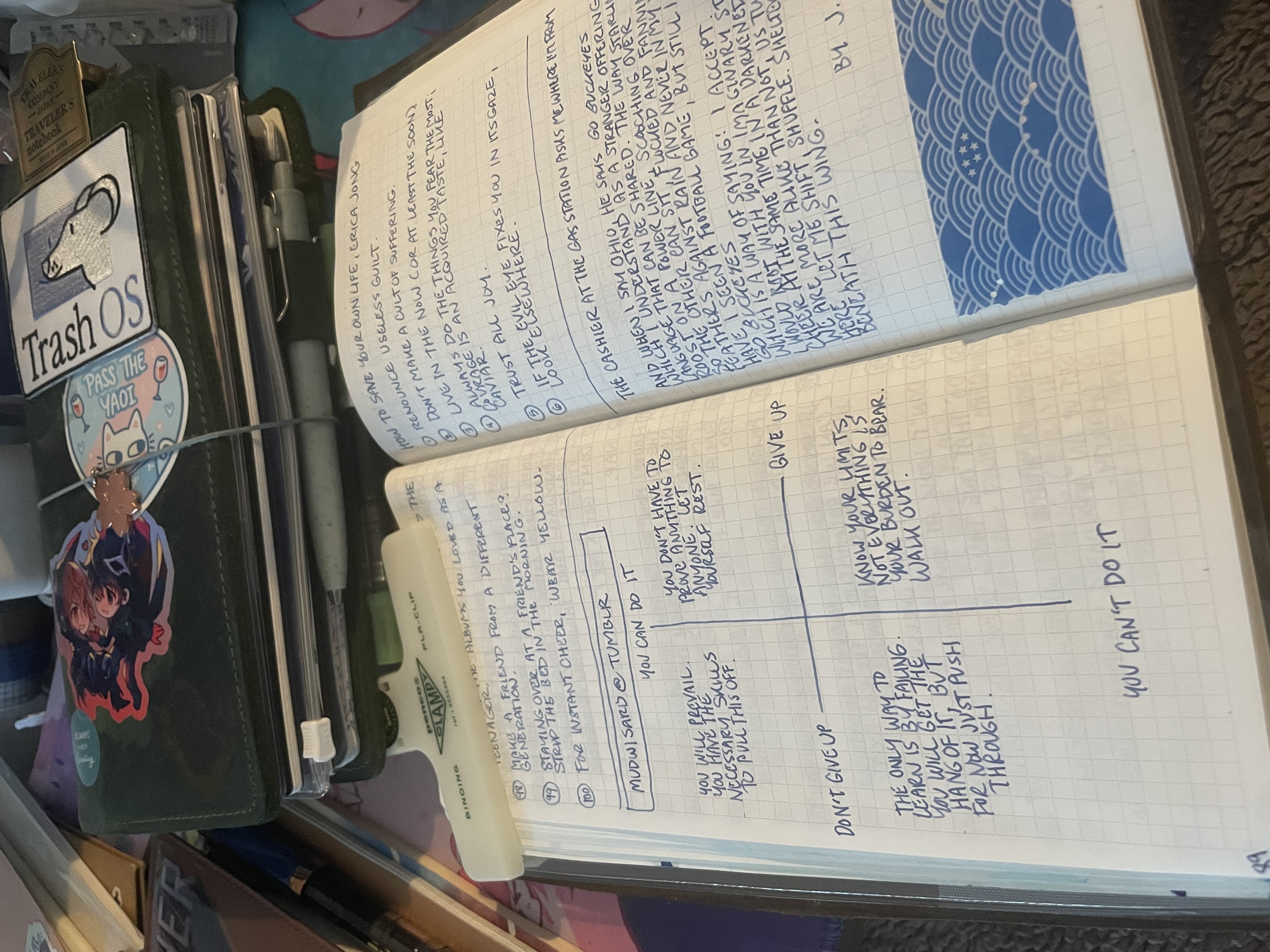 essentially, it acts as a personal guide of resources. i copy down articles and blog posts with tips on stuff that would benefit me, from mental health tips to productivity methods to accommodate my ADHD. my goal for this book is to eventually have a completely filled notebook that i can carry around with me idly read from to pass the time. it would definitely beat mindlessly scrolling on my phone.